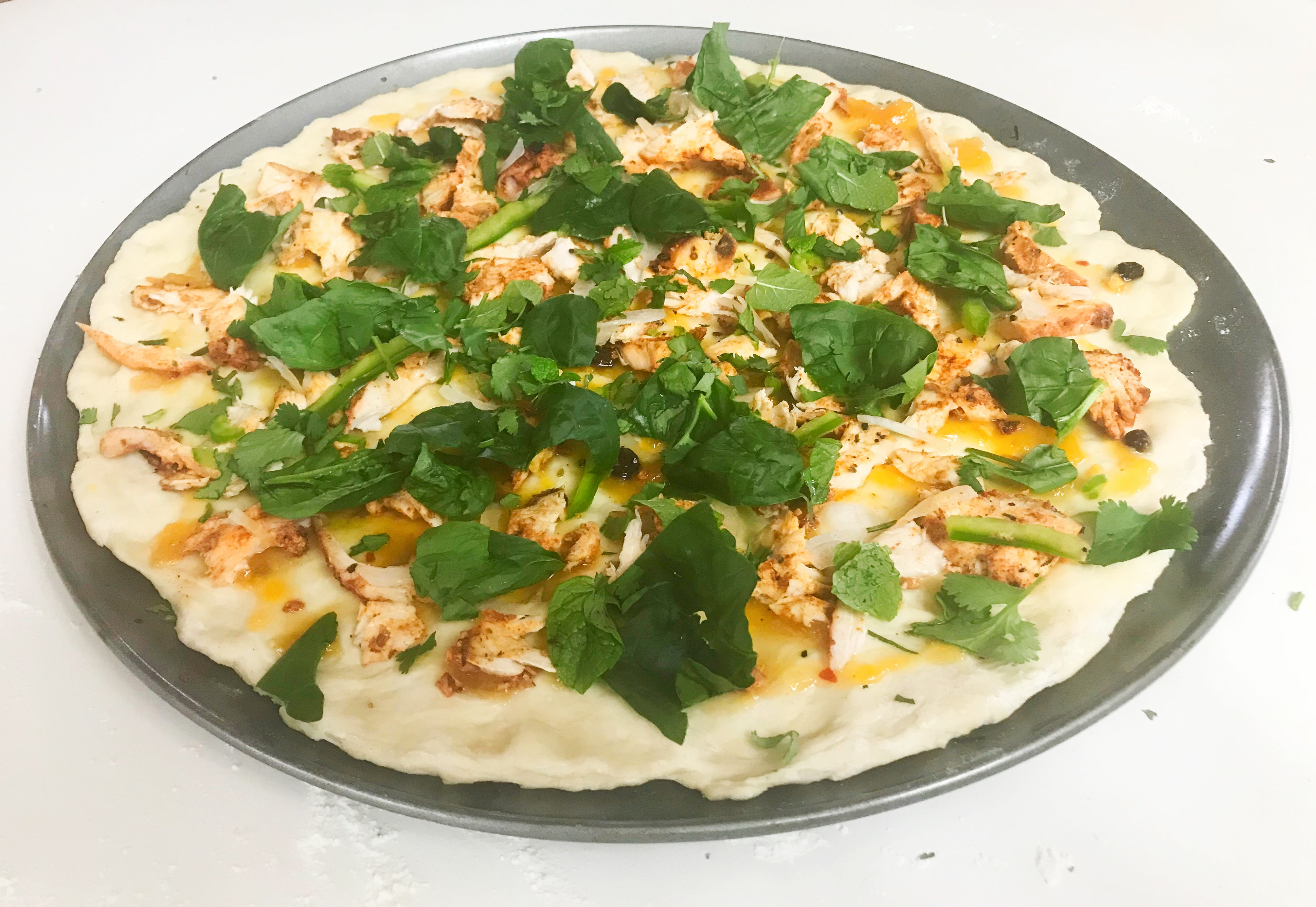 1. Stretch or roll out pizza dough onto pizza pan of choice.  Drizzle lightly with olive oil.  Spread chutney onto crust in thin layer.  Top pizza with chopped chicken, torn spinach leaves, raisins, feta, and scallion.