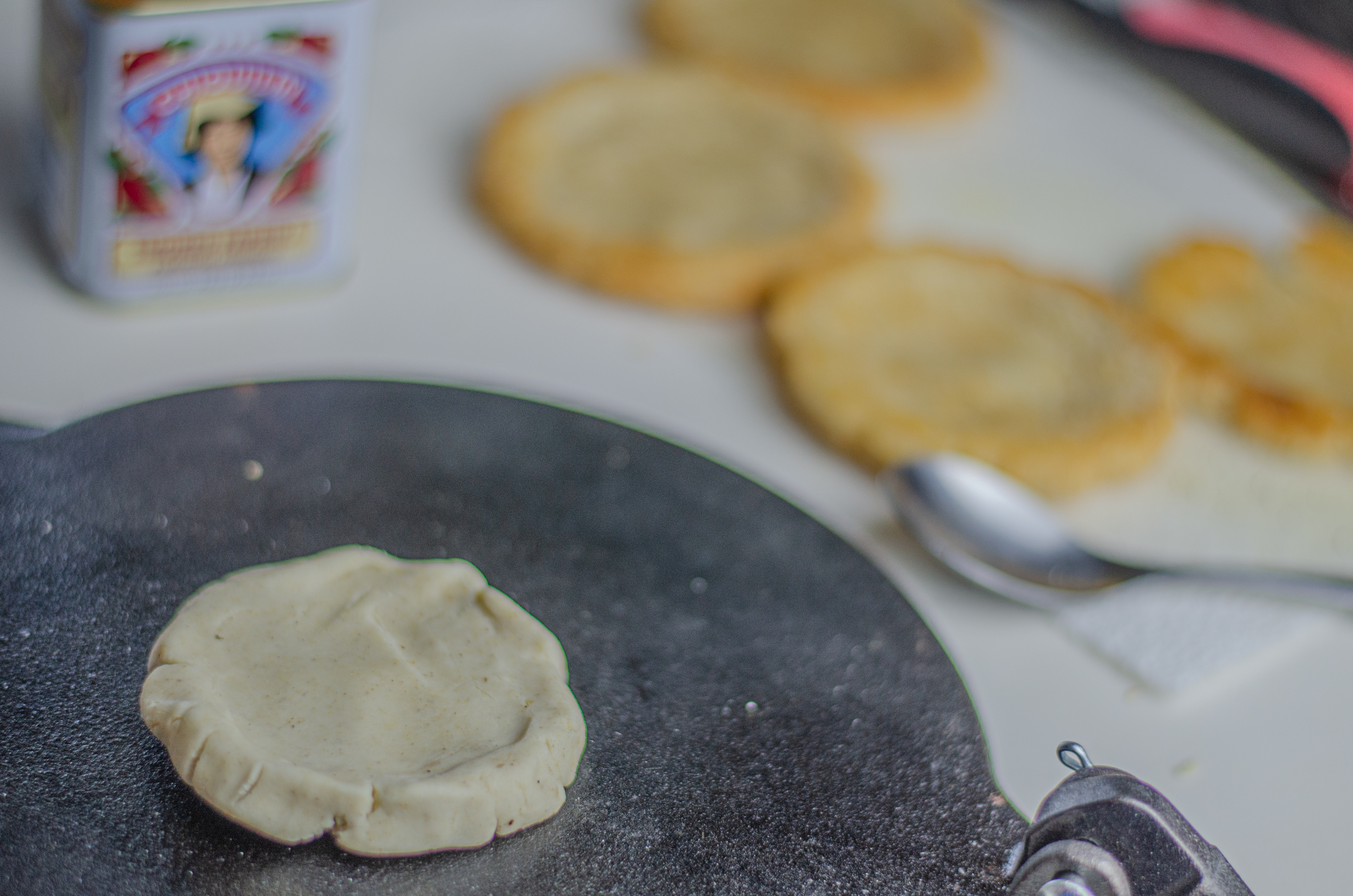 As pan heats, form dough into sopes. I pat it out with a tortilla press. Just be careful to not press too thin. A sope is thicker than a corn tortilla, and should end up about the size of a closed fist, about 1/2" thick.