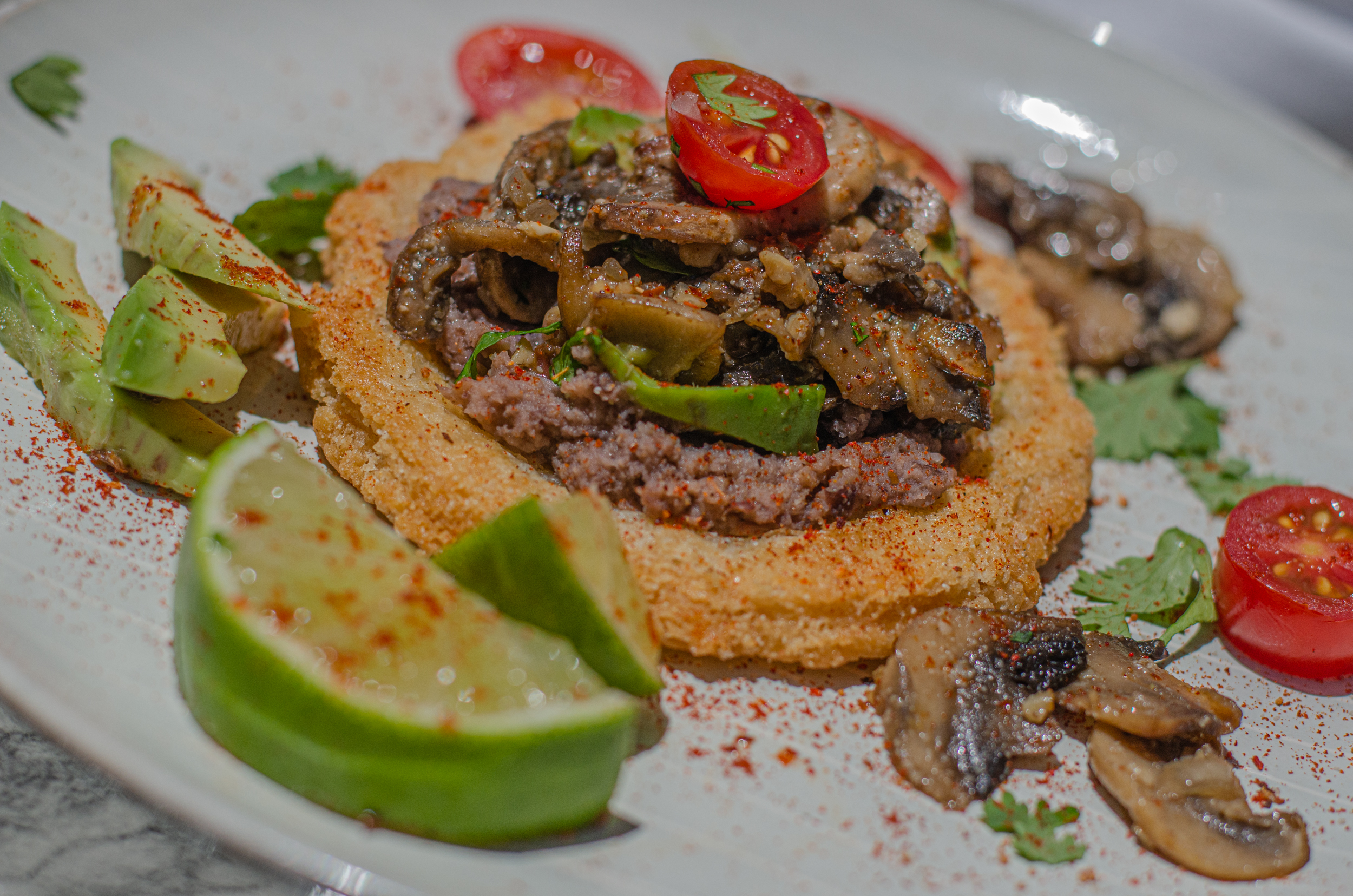 Vegan Roasted Mushroom Sopes with Refried Beans & Cherry Tomato Pico De Gallo